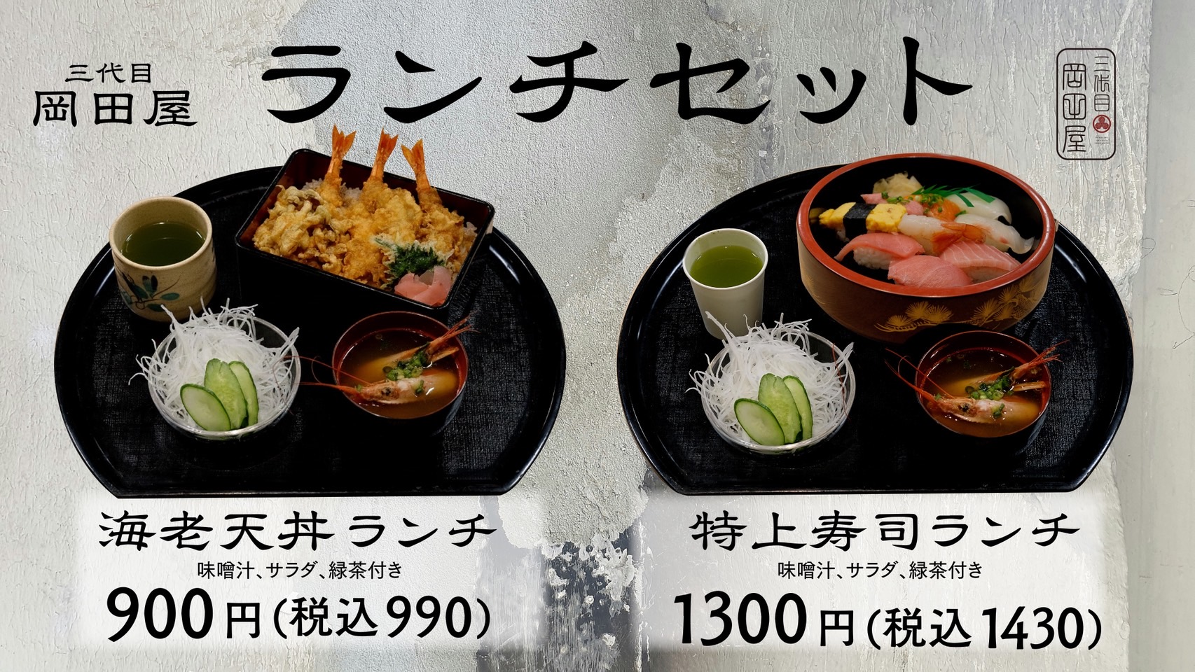 海老天丼990円(税込)、特上寿司ランチ1430円(税込)と手頃な価格設定で、味噌汁・サラダ・緑茶付きという満足度の高い内容となっている。